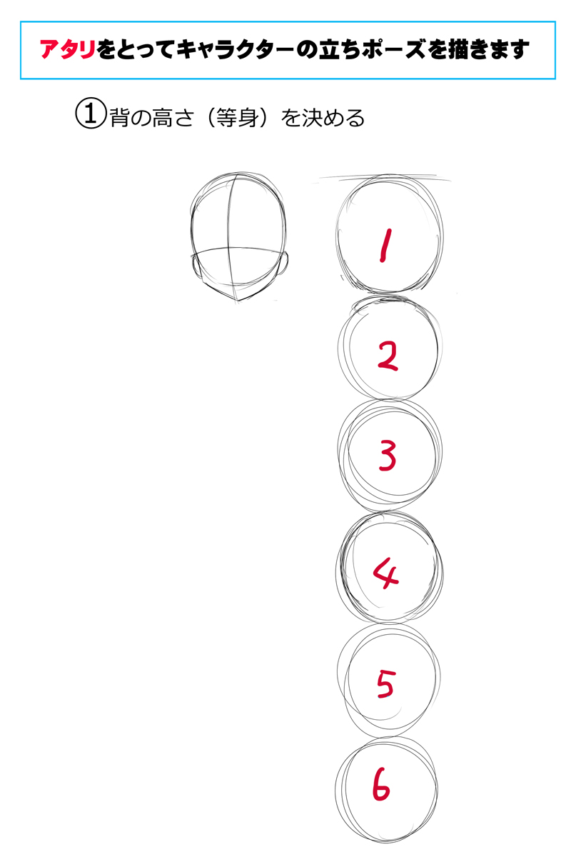 マンガ絵を描くとき、初心者の方はあまりアタリを丁寧にとらない方が多い気がします。描き慣れている方なら、ラフなアタリからも描き起こせますが、描き慣れてない方は形が想像できていないので、バランスの狂った絵になってしましがちです。