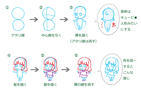 今回は服や小物などミニキャラクターをかわいく見せるパーツの描き方を説明していきますよ。SDキャラ、ちびキャラを、かわいく描いてみよう〜!