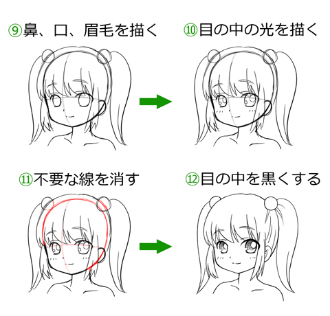 中心線を目安に鼻や口、眉毛を書き入れて、目の中も描きこみます。不要な線(中心線など)を消し、線を整えます。