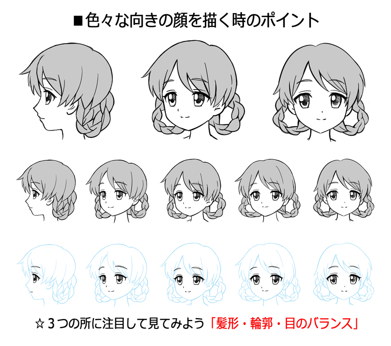 ポイントは3つ「髪型・輪郭・目のバランス」です。でも、今は「こういう事を気にして描くのか」くらいに思ってもらえれば十分です。