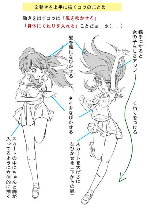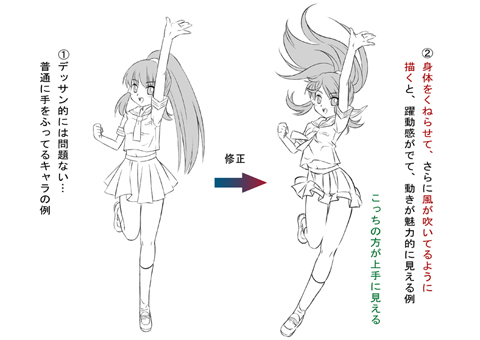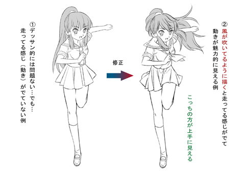 1は走ってるポーズをしてるだけって感じだけど、2は走ってる動画の一瞬のように見えませんか?同じポーズでも絵の中に風が吹いているような描き方をすると見た目がこんなに違ってくるョ(◎o◎)