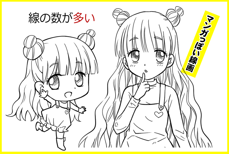 また、ちびキャラ(SDキャラ)は太めの線で描くことも多くよりシンプルに記号化された線画になります。
