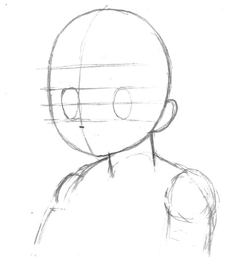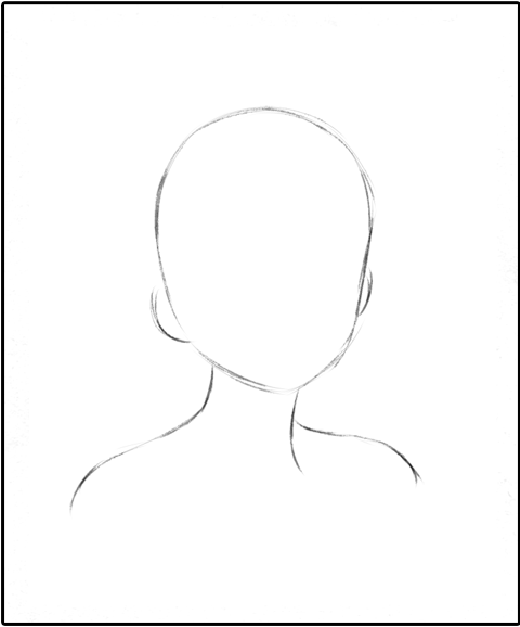 そして、髪型や輪郭、顔の目鼻立ち(おうとつ)、体におちる頭部の影を考えて描きます。文字で描くとなんだか難しく感じますが、絵にすると下のようなカンジです