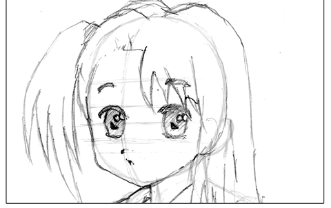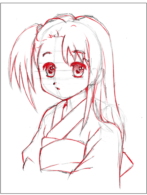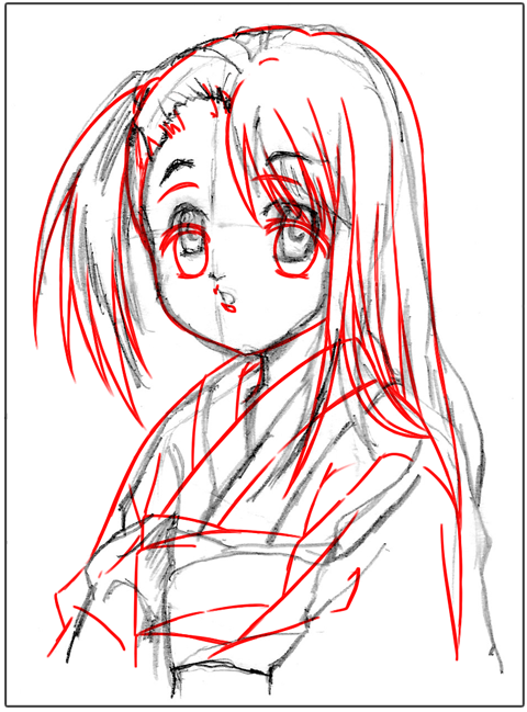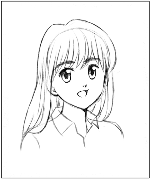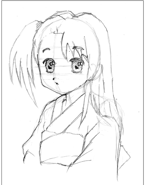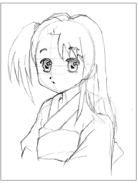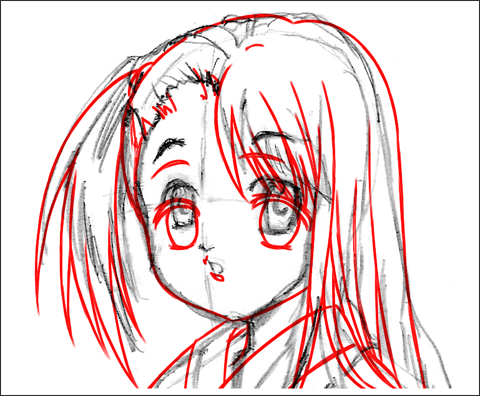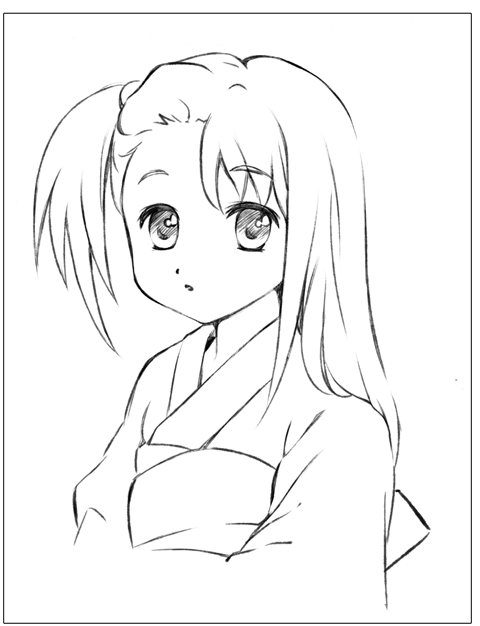 アニメ風はキャラクターの輪郭を中心に線を描きおこしていきます。一般的には線の強弱(太い細い)をつけ、服のしわなどの描線は少なく描きます。