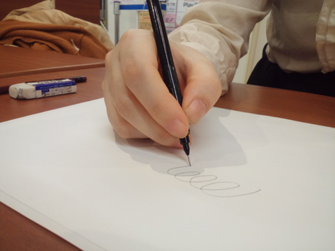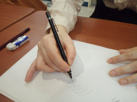 これはたまに受講生で見かける「変なペンの持ち方」をしている人の例です。くせで小指をのばして描いています。