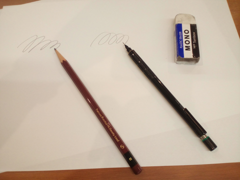 自分が描きやすいと思ったものが一番です。受講生の方の中には学校の美術の成績が悪くて、鉛筆に苦手意識をもっている方もいます。そういう人はシャープペンの方が気持ちを新たに練習できたりするようです。