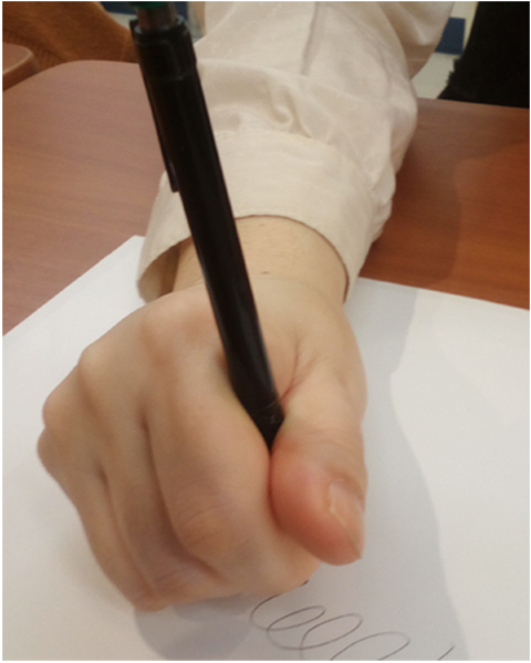 まるで筆を持っているかのように、ペンを垂直に立ってて持っている例です。この場合、紙に手の小指は全く触れていません。腕も紙にあたっていないので、自在に手を動かすことはできるのですが、手全体にふらつきがでてきます。