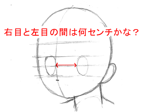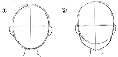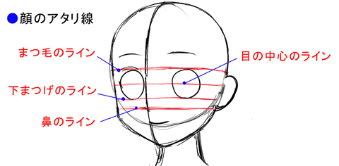 目の真ん中に横のアタリ線を入れた人が目が描きやすい人もいれば、鼻の位置に入れた方が描きやすい人もいます。皆さんはキャラの顔を描く時、どの位置に横のアタリ線を入れた方が描きやすいでしょうか?描きながら考えてみましょう。