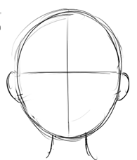 まず輪郭を描いて、それに頭部をのせて顔のベースを作ります。続いて顔の中心線を入れますが、これは曲線で描くといいでしょう。この中心線を目安にまつ毛を描いて目の位置をきめて、目を描きます。