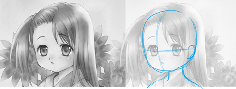 スクールの受講生の中にも「アタリを取ると下手になる」という方がいます。大きな原因のひとつは目や鼻の位置など、バランスを取ることに意識を集中しすぎて、全体の描写を考える余裕がなくなっているからだと思います。例えばバランスにこだわって、ガイコツの骨組みのようながっちりとしたアタリを描いてから描くと、普段描いているキャラよりも生気のない堅苦しい顔になってしまったり、ロボットのような死んだ表情になってしまう人もいます。