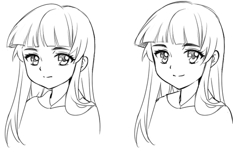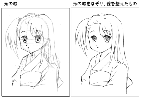 マンガ風は描線が多いので、通常はアニメっぽい線画に比べて細めの線で描くことが多いです。この2つの線画を違いを見比べ、自分で描くときも意識して線画を見るようにしてください