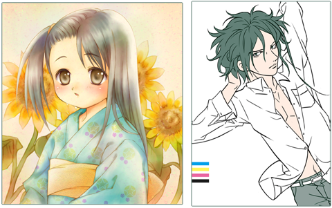 アナログでのマンガ絵はキャラクターの輪郭線などを描いて、モノクロで仕上げたり、彩色をしたりします。