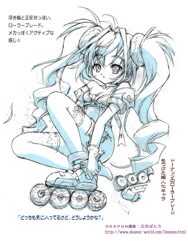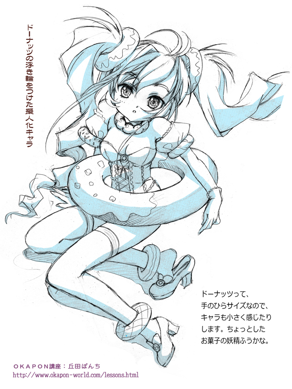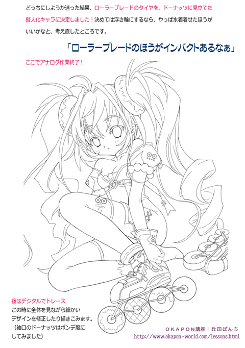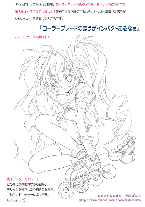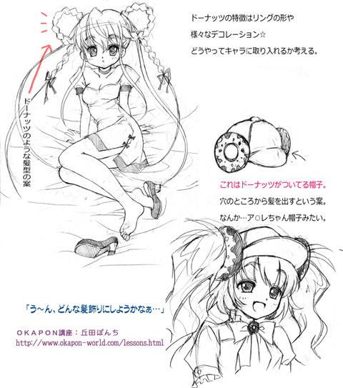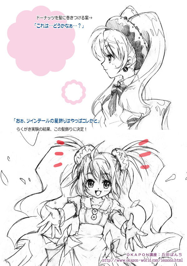 髪飾りが決まったら、次はドーナッツを何かに見立てて、ファッションや、小道具としてキャラに取り込みます。このあたりで、気に入ったラフ絵を細かく描き込んで下描きにしていきます☆この2つのラフは気に入ったので、2つとも描きこんでみました☆