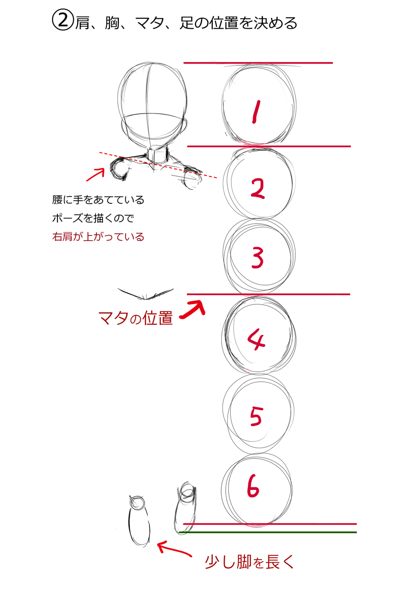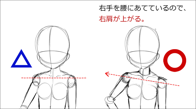 ◎肩の位置を決めます。今回は腰に手を当てているポーズなので、右肩が上がっています。