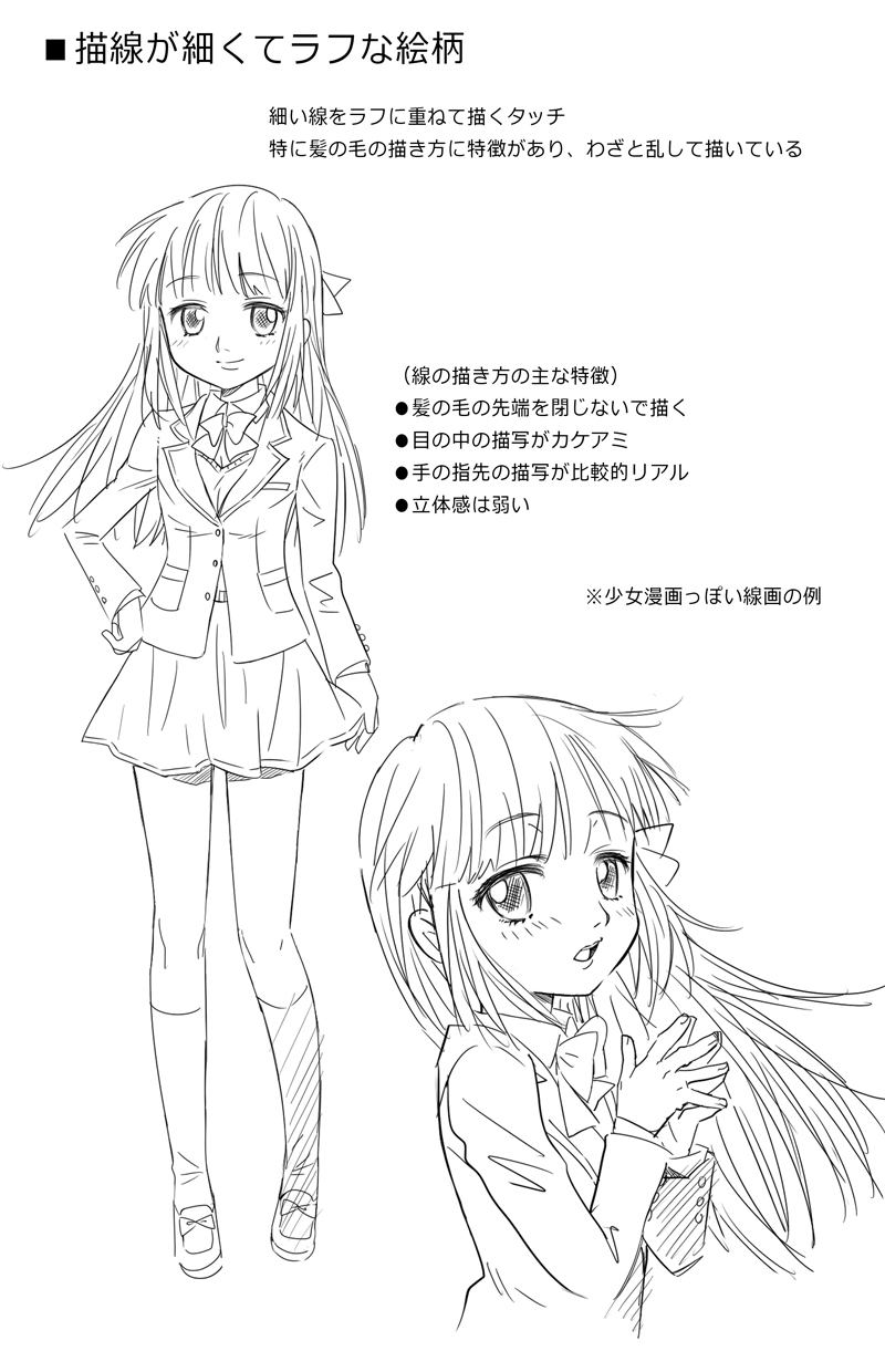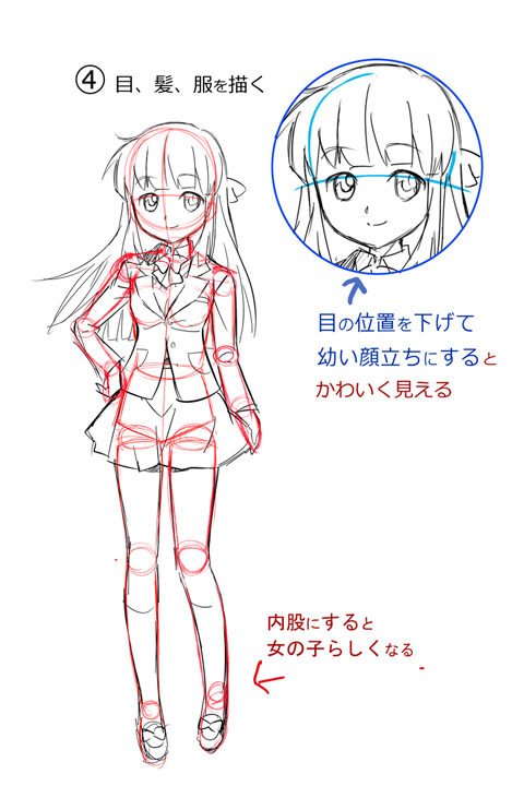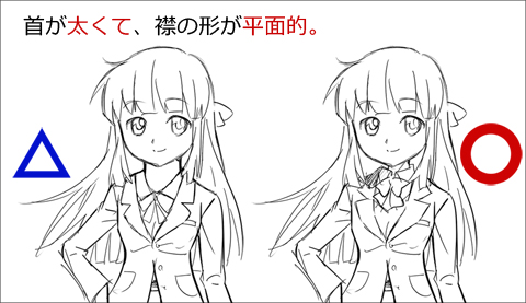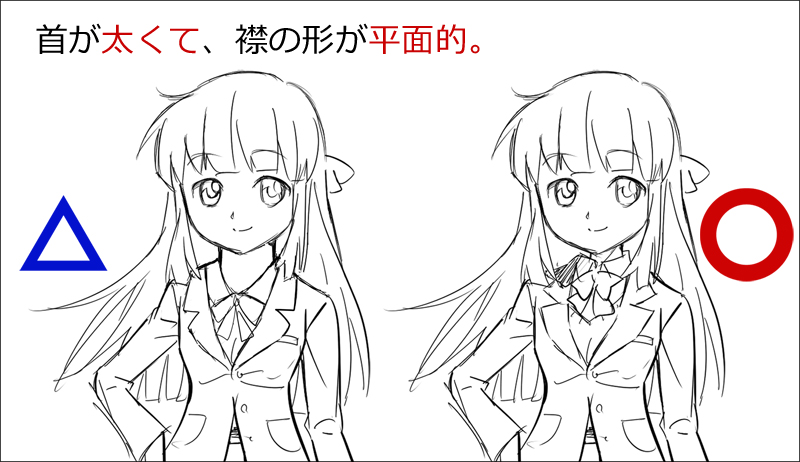 ここまで描いて何となく「かわいくない」と思うときは、大抵の原因は女の子の首の太さと肩幅の大きさにあります。首は細めに(例外もありますが)肩幅は狭く(なで肩で)描くとかわいくなるかと思います。