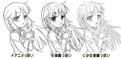 同じアタリから描いたAパターンのマンガ風やBパターンのマンガ風の絵柄とはずいぶん違いますよね。