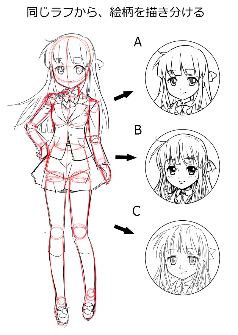 これでベースとなる下描き(ラフ絵)ができました。では続いて、ここから3タイプのキャラクターの描きわけをしてみたいと思います。
