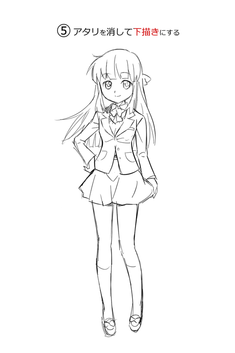 もともと、このラフ絵はアニメ風をイメージして描いてきましたので、そのまま、アタリを消して線を整えます