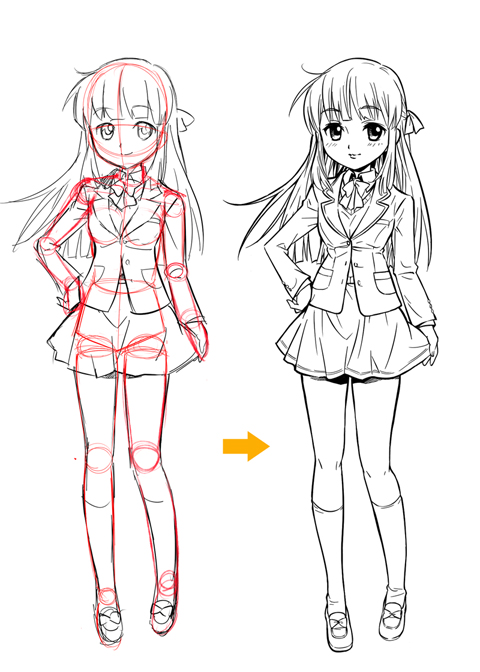 これは初心者の方によくあるパターンですが、描く時にキャラクターの頭身を考えないで(顔から順番に)描きはじめると、身体がでっかくなりすぎる場合があります。