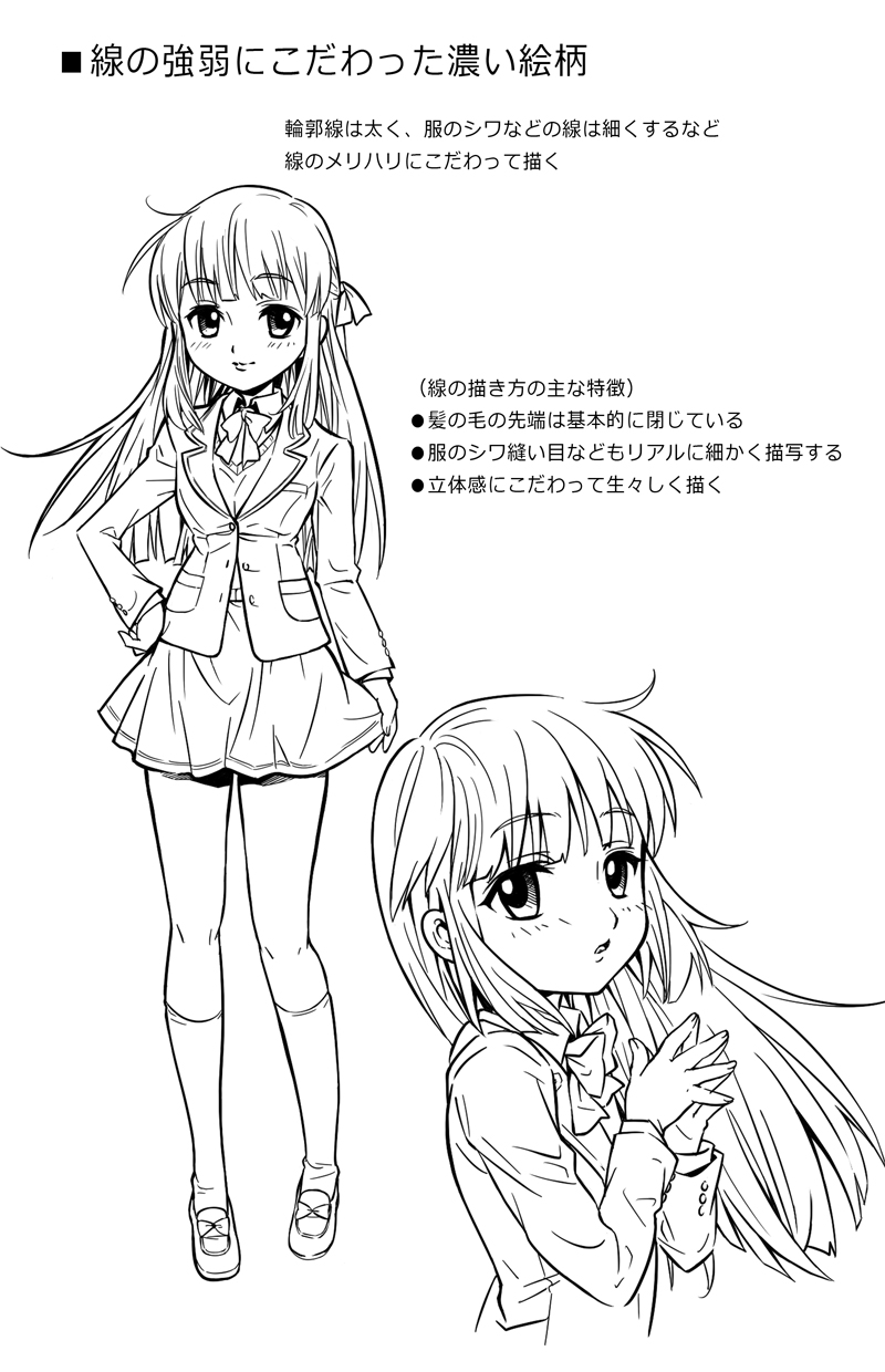 目の描きこみや髪の毛、服のシワなどを細かく描きこみ、また全体に線の強弱をはっきりとさせています。