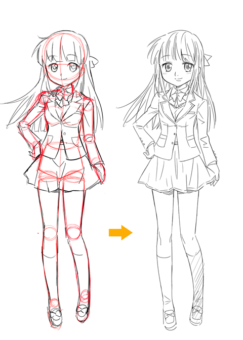 では、ベースとなる基本的な6頭身のキャラクターを描いてみたいと思います。はじめは描線の数が少なくて、色々なタッチに変更しやすいアニメっぽい絵柄をイメージして描いてみます。