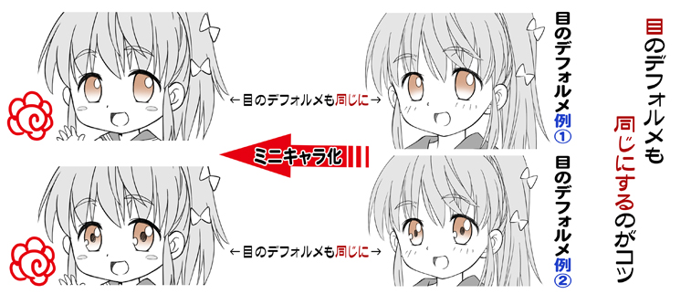目のデフォルメ例2では、目の中の、黒目部分を追加してあります。このような場合、ここが特徴になってるので、ミニキャラも同じように目の中の、黒目部分を描くと似てきます。