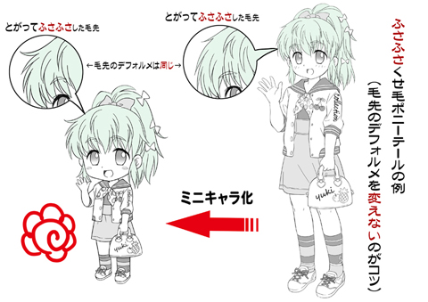 今回はポニーテール例に、ミニキャラを描くときの、髪の毛のデフォルメのコツについて説明します__φ(..)
