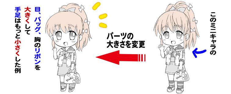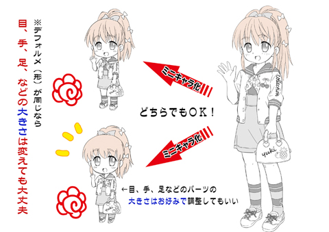 ミニキャラを描くとき、デフォルメの形が同じであれば、目、口、鼻、などのパーツの大きさは変えても大丈夫ってことです。