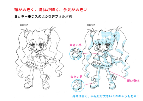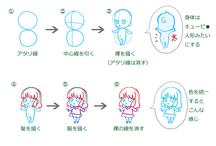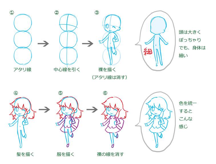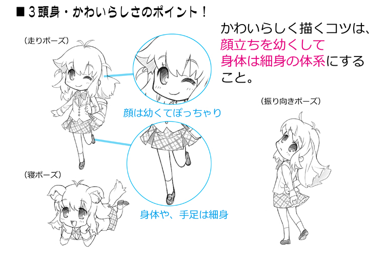 3頭身キャラのコツは、顔は幼く、ぽっちゃり顔にして、身体は細身(ウエストがくびれているように)にするとかわいく見えます!