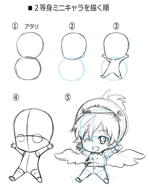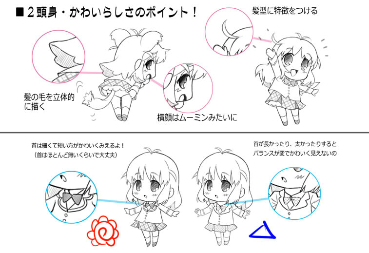 2頭身キャラのコツは、顔も身体もぽっちゃりな幼児体系(キューピ○人形みたい)にして、首を細く短く描くとかわいく見えます!