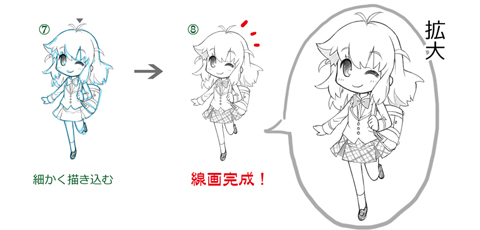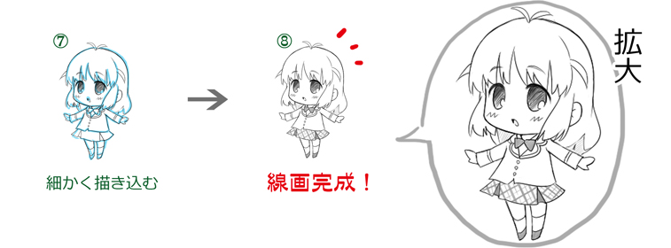 ミニキャラはすごく小さいため、体や手足のちょっとした長さの違いで、バランスが変になって、かわいくなくなってしまうので気をつけよう。
