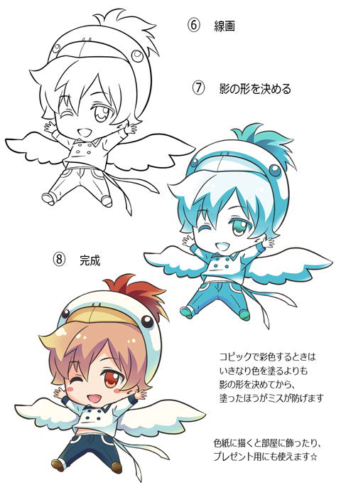髪の毛と、目のデフォルメのコツを覚えて、かわいいミニキャラをたくさん描いてみてね☆
