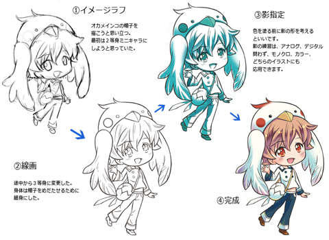 上の絵は3頭身ミニキャラのマンガ風タッチで描いたものです。