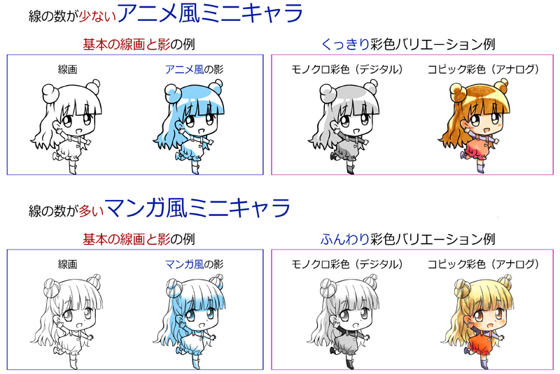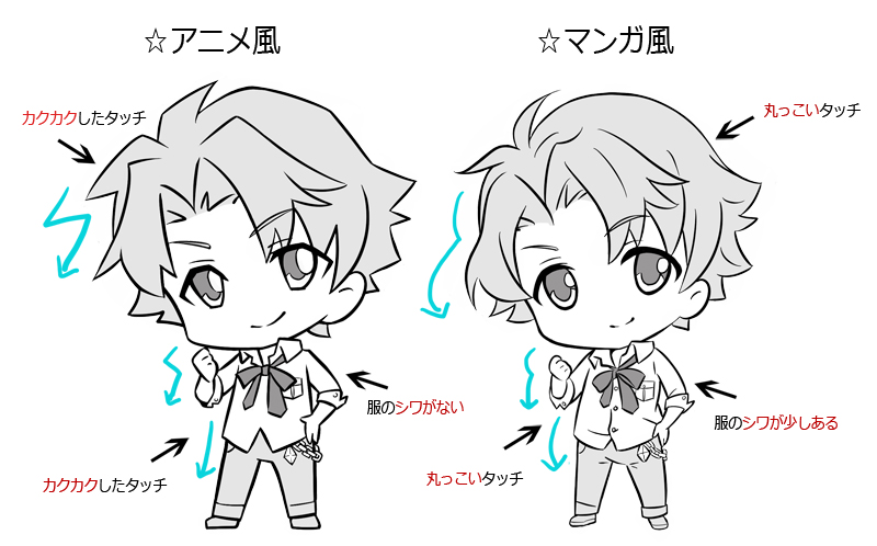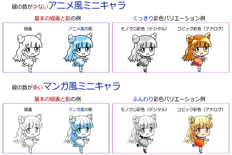 ミニキャラのデフォルメは大きくわけて、アニメ風とマンガ風の2パターンがあります。