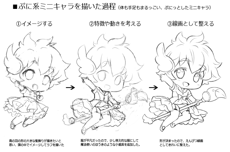 わたしはこんな風にミニキャラを描いてます。参考になればうれしいです