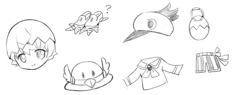 ここから、キャラクターに着せる服を考えていきます。最初に思いついたのが、ニワトリのデザインの帽子ですね。次に思いついたのがニワトリのしっぽをイメージさせるような、ズボンのウエストについている長いリボンです。