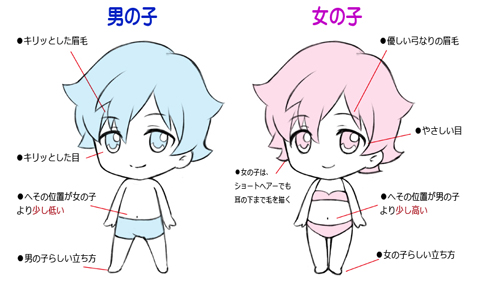 次にミニキャラの男キャラと女キャラの違いについてです。こちらも比較してみてください。チビな幼児体系なので、男女差っていっても少ないですね。大切なのは雰囲気でしょうか。男の子らしさ、女の子らしさを感じられれば(絵心を持てば)描き分けられると思います。