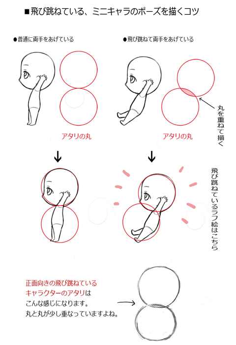 そこで普通の立ちポーズと、飛び跳ねているポーズの違いを説明します。アタリの描き方が違うので、チェックしてみよう〜☆