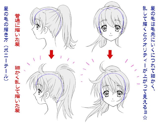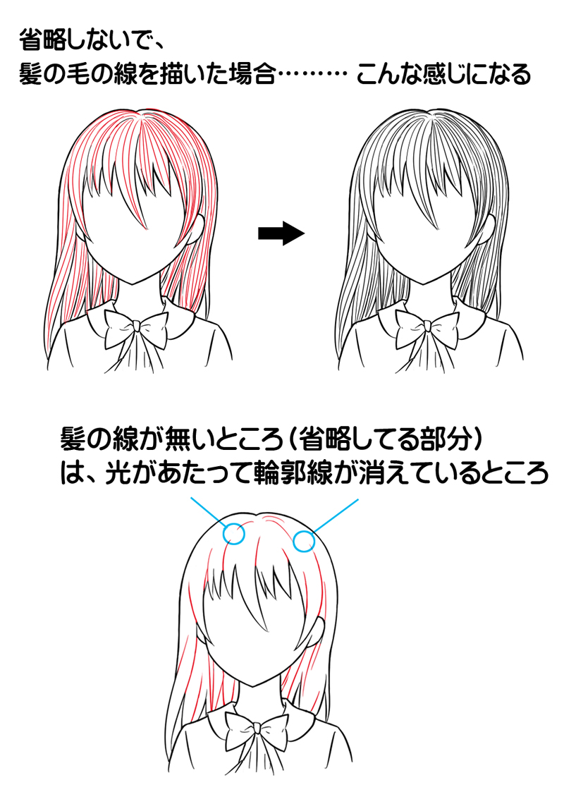 また、髪の毛の線の数を少なく描くとアニメっぽい感じに見えます。