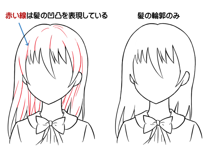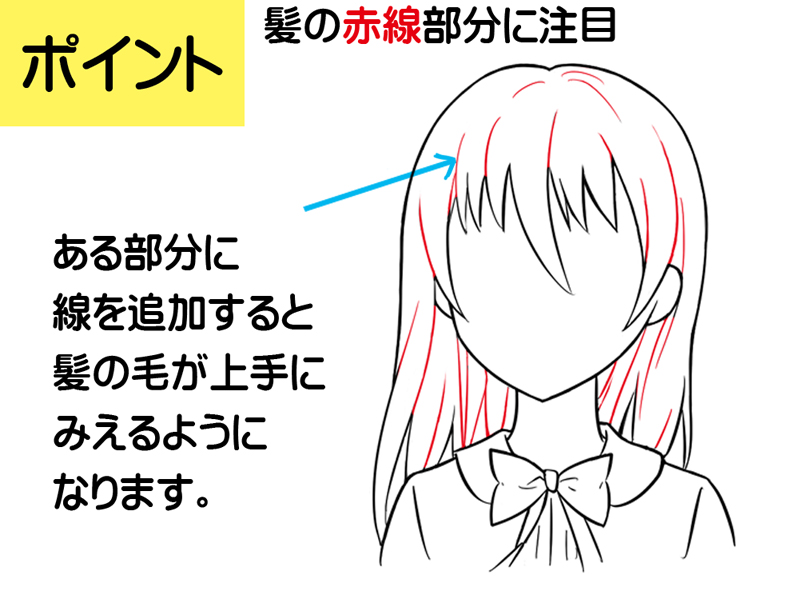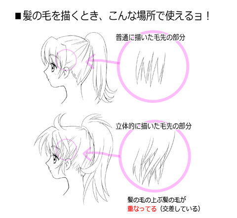(線の数を多く描くときは髪の毛の流れに沿うように増やそう)