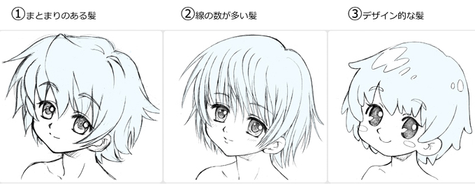 髪型は色々あります。それをきれいに描くコツは、その髪型の形を理解して髪の毛の生えている方向(流れ)にそって描いていくことです。
