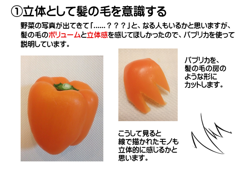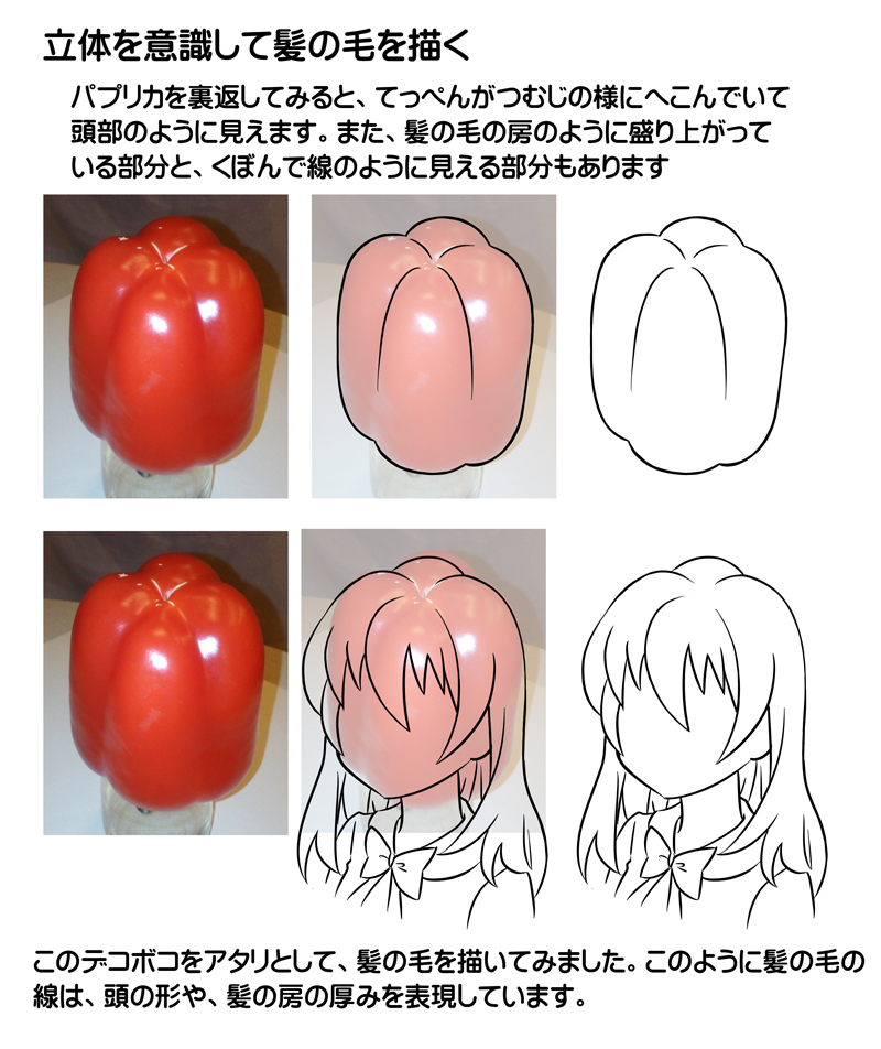 ちょっとした事ですが、キャラクターの頭部を描く時、表面のデコボコを意識して描く事も、とても大切です。パプリカの下側をアタリに描いてみます。