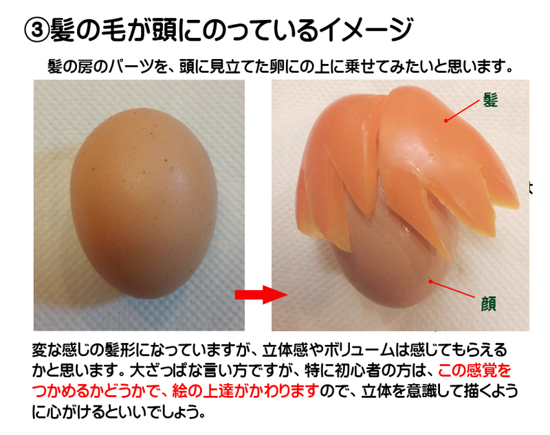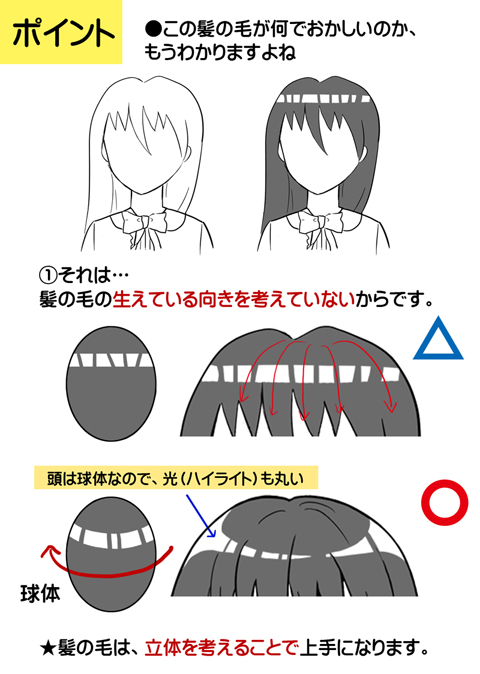 キャラクターを描きはじめたばかりの頃は、髪の輪郭ばかり気にしてしまい、平面的でなんだか変な感じになりがちです。