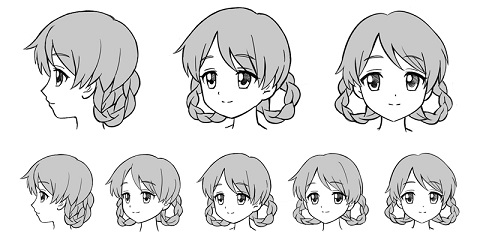 顔の向きが変わると目の見え方も変わります。ここでは同じキャラクターの顔を色々な向きで観察してみます。