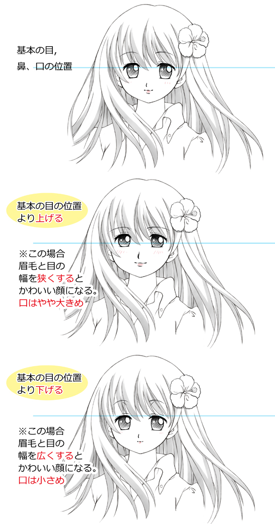 目の配置は、基本より上げても下げてもかわいい顔にすることはできます。ただし、それに合わせて、眉毛の位置や、鼻と口の位置もちゃんと調整すること!調整しないと変な顔になっちゃうかも…(つд⊂)