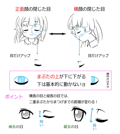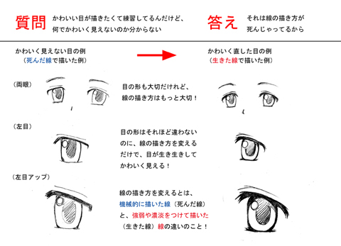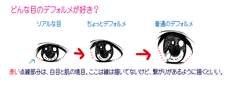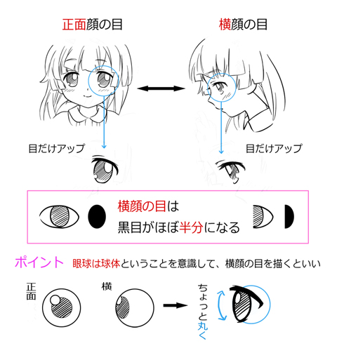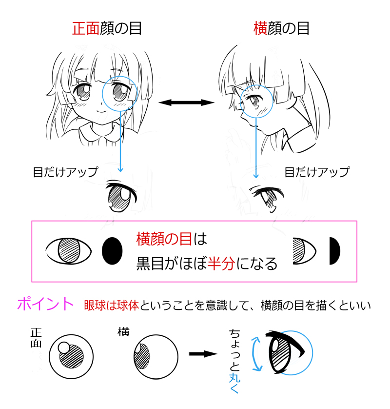 上の説明では目の部分の違いを見てもらうため、抜き出してありますが、眼だけを描いて練習することはあまりオススメしません。目は顔の向きが変わると変化してしまうので、顔を描いて、その向き(角度)にあわせて目を描きこむ練習をすることが大切です。