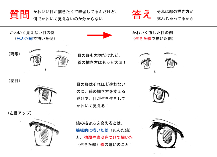 かわいい目が描きたいのに描けなくて困ってる人で、目の形を気にしてる人はよくいるけれど、線の描き方はあまり気にしてる人がいないような気がします…(ToT)