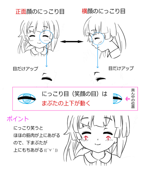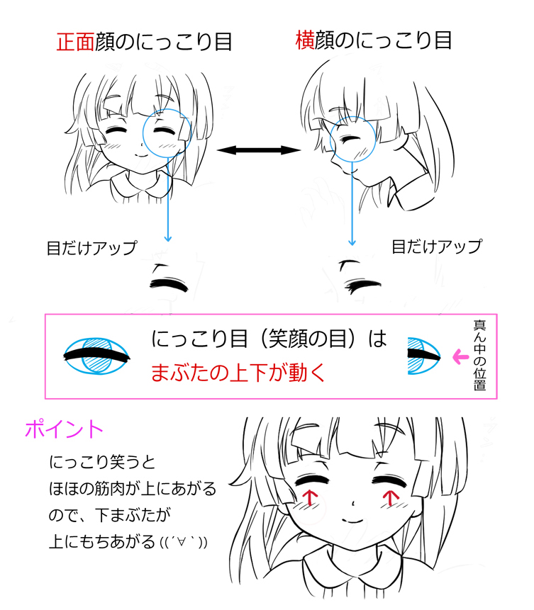 ここでのポイントは目を閉じたときです。赤い※印のところをよ〜く見てください。中央の※印は目を瞑っている状態、右は笑ったときによくある閉じた目の描き方です。