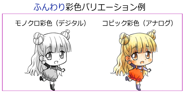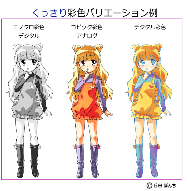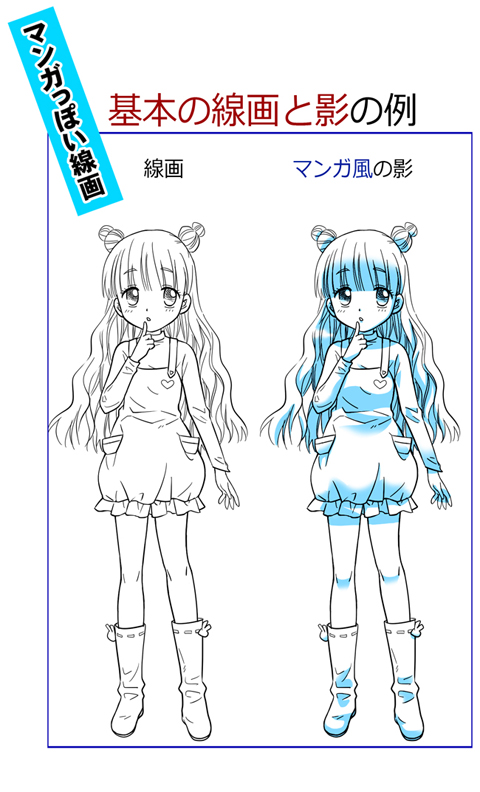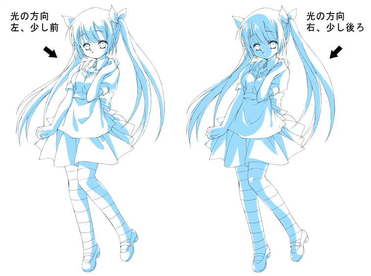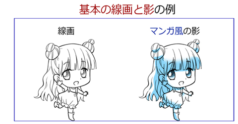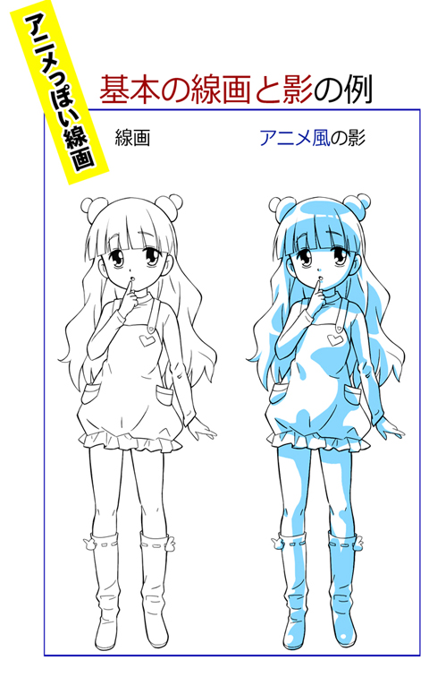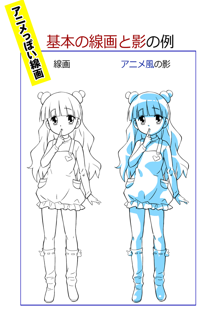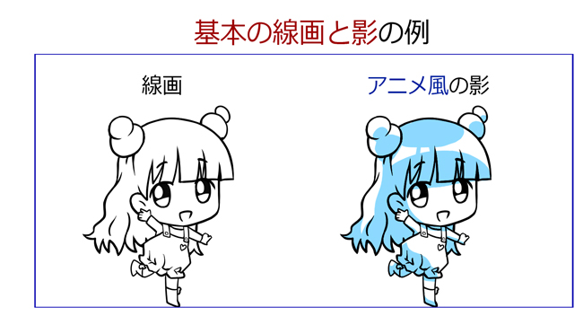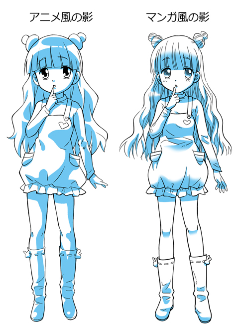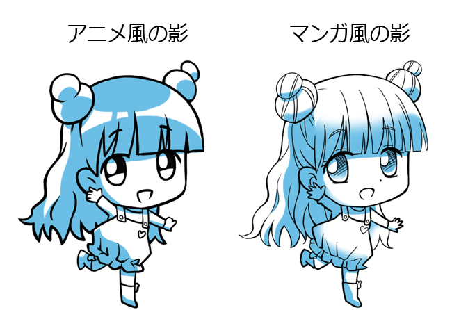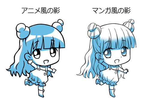 最後にアニメ風の影、マンガ風の影のつけ方の違いを、キャラクターで比べて見てみましょう。