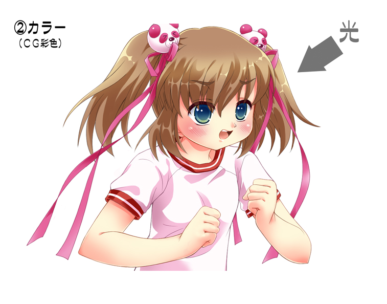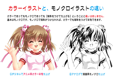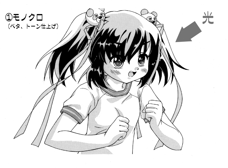 参考例として体操服を着た女の子のイラストを、線画は同じでカラーとモノクロで処理してみました。